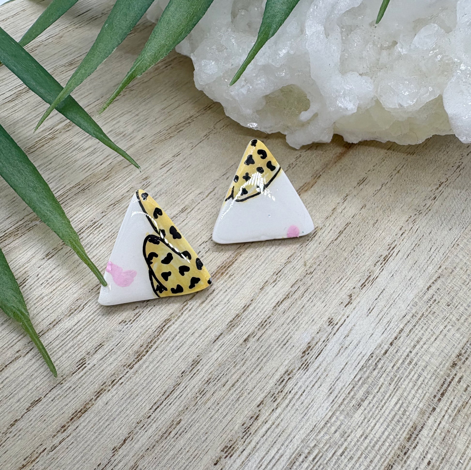 Handcrafted with durable polymer clay, each earring is unique and charming. They are sure to add a colorful touch to your wardrobe and are perfect for everyday wear. However, we recommend handling them with care to maintain their one-of-a-kind design.