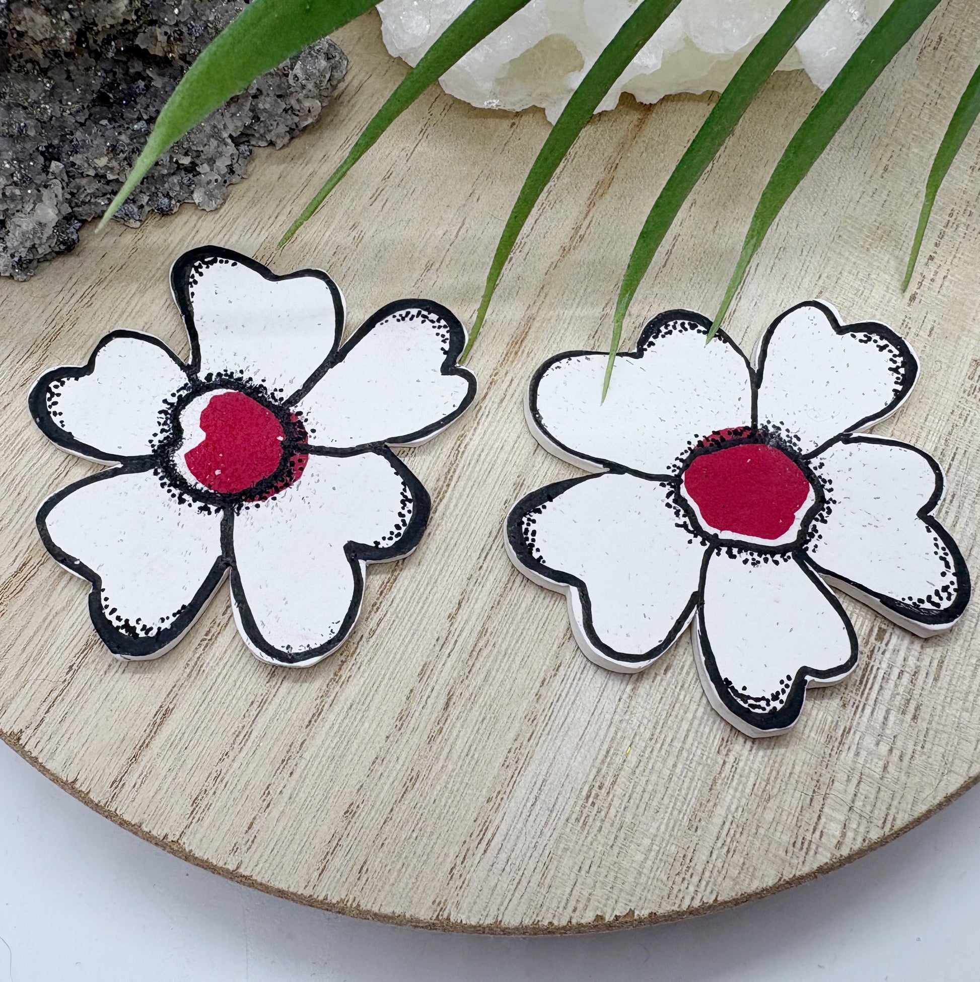 Introducing Aniya Flower studs in red, the perfect accessory for those with sensitive ears! These adorable studs are hand cut and lightweight, making them comfortable for all-day wear. With titanium posts, you can show off your style without worrying about irritation. Flower power at its finest!